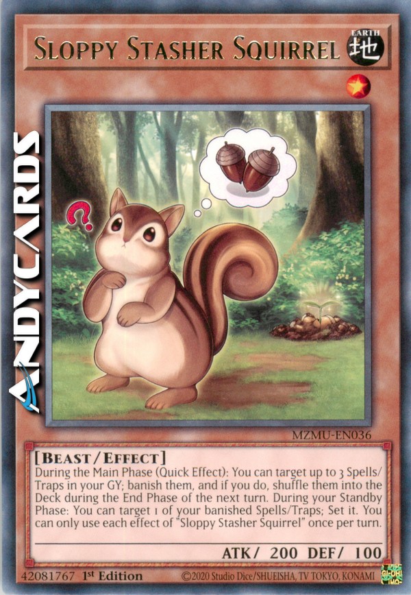 During the Main Phase (Quick Effect): You can target up to 3 Spells/Traps in your GY; banish them, and if you do, shuffle them into the Deck during the End Phase of the next turn. During your Standby Phase: You can target 1 of your banished Spells/Traps; Set it. You can only use each effect of "Sloppy Stasher Squirrel" once per turn.