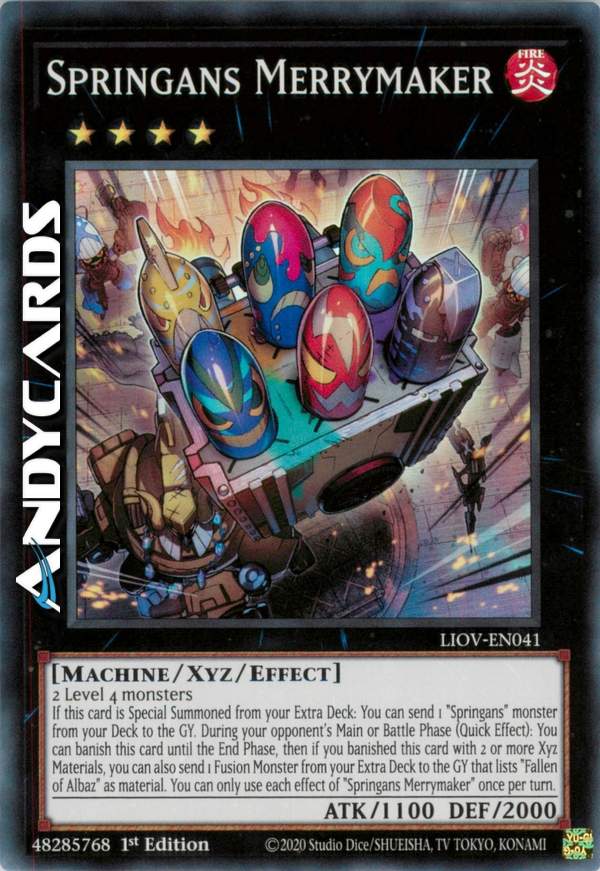 If this card is Special Summoned from your Extra Deck: You can send 1 "Springans" monster from your Deck to the GY. During your opponent's Main or Battle Phase (Quick Effect): You can banish this card until the End Phase, then if you banished this card with 2 or more Xyz Materials, you can also send 1 Fusion Monster from your Extra Deck to the GY that lists "Fallen of Albaz" as material. You can only use each effect of "Springans Merrymaker" once per turn.