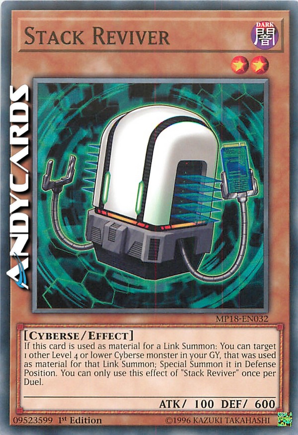 If this card is used as material for a Link Summon: You can target 1 other Level 4 or lower Cyberse monster in your GY, that was used as material for that Link Summon; Special Summon it in Defense Position. You can only use this effect of "Stack Reviver" once per Duel.
