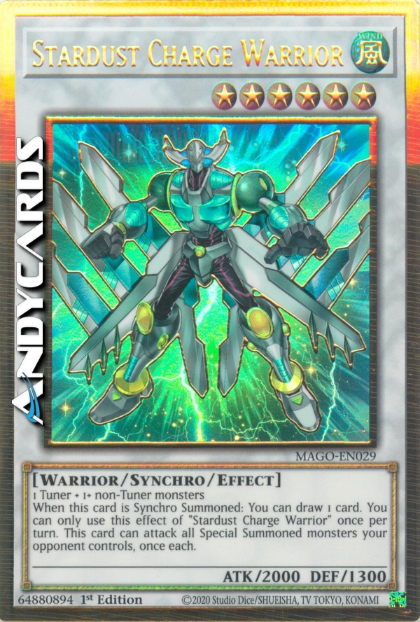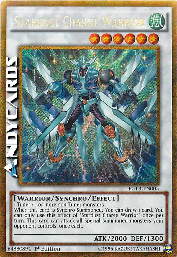 1 Tuner + 1 or more non-Tuner monsters - When this card is Synchro Summoned: You can draw 1 card. You can only use this effect of "Stardust Charge Warrior" once per turn. This card can attack all Special Summoned monsters your opponent controls, once each.