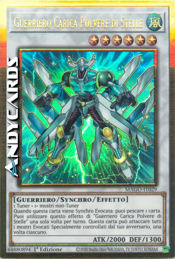 1 Tuner + 1 o più mostri non-Tuner - Quando questa carta viene Synchro Evocata: puoi pescare 1 carta. Puoi utilizzare questo effetto di "Guerriero Carica Polvere di Stelle" una sola volta per turno. Questa carta può attaccare tutti i mostri Evocati Specialmente controllati dal tuo avversario, una volta ciascuno.