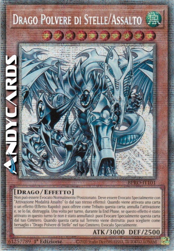 Non può essere Evocato Normalmente/Posizionato. Deve essere Evocato Specialmente con "Attivazione Modalità Assalto" (o dal suo stesso effetto). Quando viene attivata una carta o un effetto (Effetto Rapido): puoi offrire come Tributo questa carta; annulla l'attivazione e, se lo fai, distruggila. Una volta per turno, durante la End Phase, se questo effetto è stato attivato in questo turno (e non è stato annullato): puoi Evocare Specialmente questa carta dal tuo Cimitero. Quando questa carta sul Terreno viene distrutta: puoi scegliere come bersaglio 1 "Drago Polvere di Stelle" nel tuo Cimitero; Evocalo Specialmente.