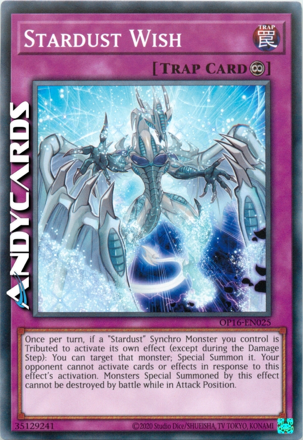 Once per turn, if a "Stardust" Synchro Monster you control is Tributed to activate its own effect (except during the Damage Step): You can target that monster; Special Summon it. Your opponent cannot activate cards or effects in response to this effect's activation. Monsters Special Summoned by this effect cannot be destroyed by battle while in Attack Position.