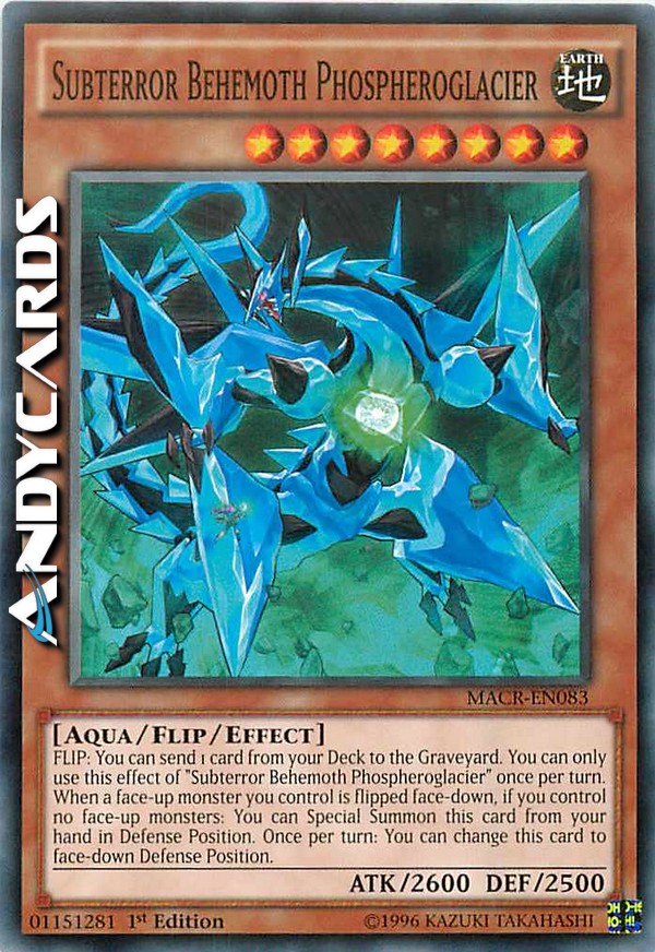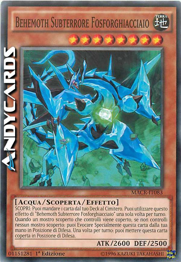 SCOPRI: Puoi mandare 1 carta dal tuo Deck al Cimitero. Puoi utilizzare questo effetto di "Behemoth Subterrore Fosforghiacciaio" una sola volta per turno. - Quando un mostro scoperto che controlli viene coperto, se non controlli nessun mostro scoperto: puoi Evocare Specialmente questa carta dalla tua mano in Posizione di Difesa. Una volta per turno: puoi mettere questa carta coperta in Posizione di Difesa.