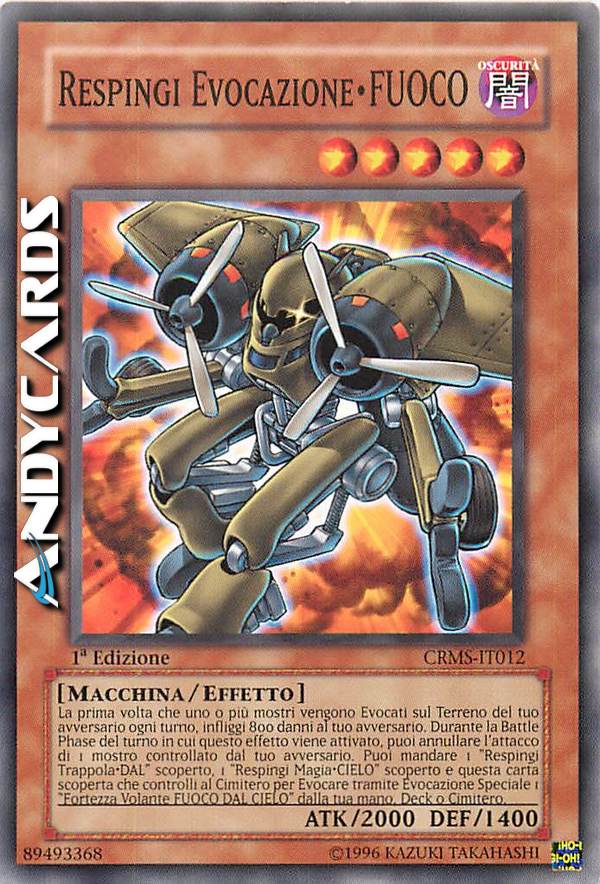 La prima volta che 1 o più mostri vengono evocati sul terreno del tuo avversario ogni turno,infliggi 800 danni al tuo avversario.Durante la battle phase del turno in cui questo effetto viene attivato,puoi annullare l'ATK di un mostro controllato dal tuo avversario.Puoi mandare 1 "respingi trappola-DAL"scoperto,1 "respingi magia-CIELO"scoperto e questa scoperta che controlli al cimitero per evocare tramite evocazione speciale 1"fortezza volante-FUOCO DAL CIELO"dalla tua mano,deck o cimitero.