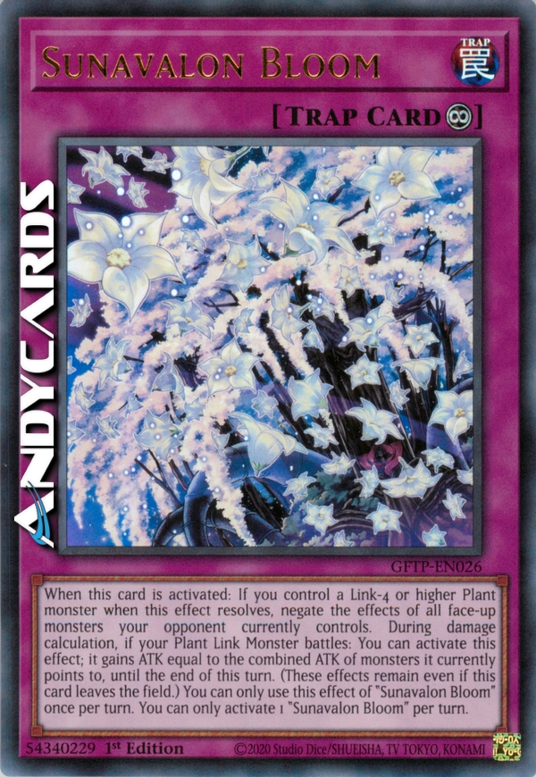 When this card is activated: If you control a Link-4 or higher Plant monster when this effect resolves, negate the effects of all face-up monsters your opponent currently controls. During damage calculation, if your Plant Link Monster battles: You can activate this effect; it gains ATK equal to the combined ATK of monsters it currently points to, until the end of this turn. (These effects remain even if this card leaves the field.) You can only use this effect of "Sunavalon Bloom" once per turn. You can only activate 1 "Sunavalon Bloom" per turn.