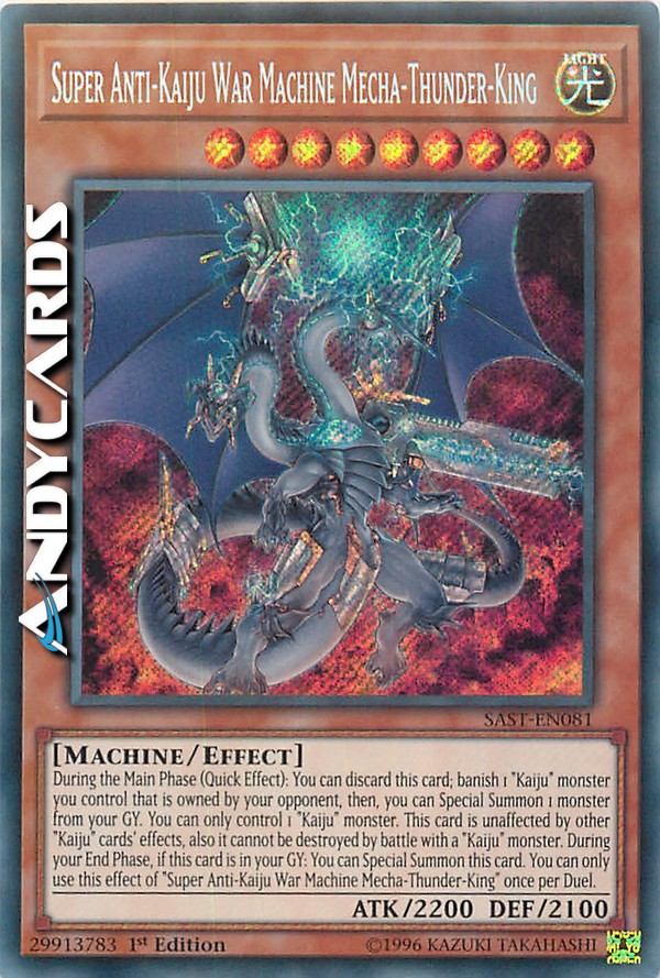Durante la Main Phase (Effetto Rapido): puoi scartare questa carta; bandisci 1 mostro "Kaiju" che controlli di proprietà del tuo avversario, poi, puoi Evocare Specialmente 1 mostro dal tuo Cimitero. Puoi controllare solo 1 mostro "Kaiju". Questa carta è immune agli effetti delle altre carte "Kaiju", inoltre non può essere distrutta in battaglia con un mostro "Kaiju". Durante la tua End Phase, se questa carta è nel tuo Cimitero: puoi Evocare Specialmente questa carta. Puoi utilizzare questo effetto di "Super Macchina da Guerra Anti-Kaiju Mecha-Re-Tuono" una sola volta per Duello.
