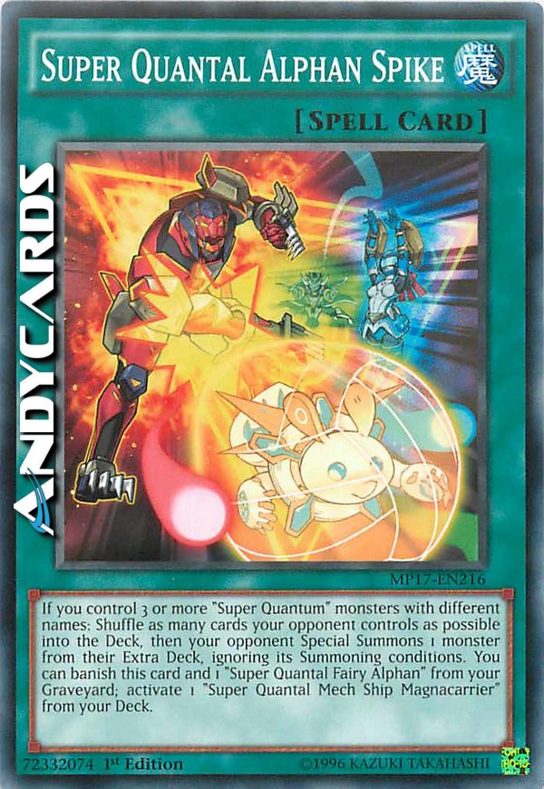 Se controlli 3 o più mostri "Super Quantum" con nomi diversi: mischia tante carte controllate dal tuo avversario quante possibile nel Deck, poi il tuo avversario Evoca Specialmente 1 mostro dal suo Extra Deck, ignorando le sue condizioni di Evocazione. Puoi bandire questa carta e 1 "Super Quantal Fata Alfan" dal tuo Cimitero; attiva 1 "Super Quantal Nave Mech Magnatrasportatore" dal tuo Deck.