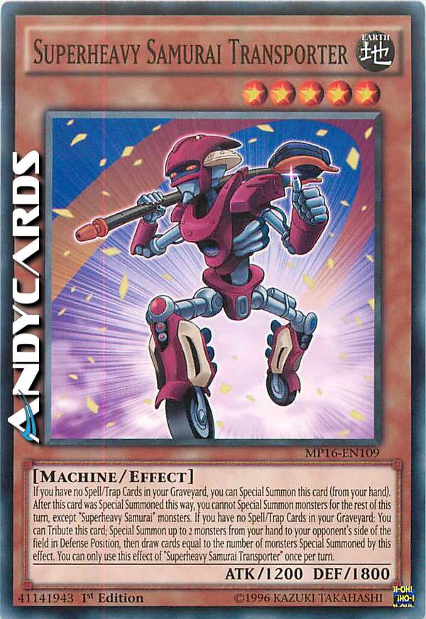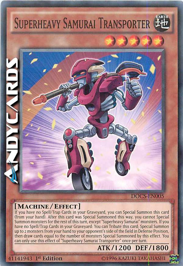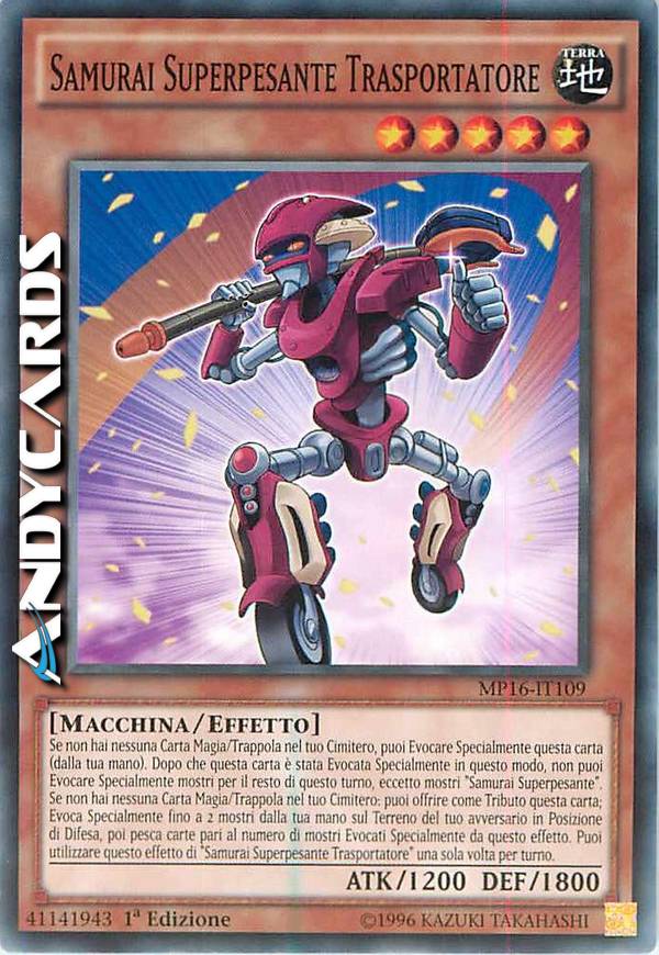 Se non hai nessuna Carta Magia/Trappola nel tuo Cimitero, puoi Evocare Specialmente questa carta (dalla tua mano). Dopo che questa carta è stata Evocata Specialmente in questo modo, non puoi Evocare Specialmente mostri per il resto di questo turno, eccetto mostri "Samurai Superpesante". Se non hai nessuna Carta Magia/Trappola nel tuo Cimitero: puoi offrire come Tributo questa carta; Evoca Specialmente fino a 2 mostri dalla tua mano sul Terreno del tuo avversario in Posizione di Difesa, poi pesca carte pari al numero di mostri Evocati Specialmente da questo effetto. Puoi utilizzare questo effetto di "Samurai Superpesante Trasportatore" una sola volta per turno.