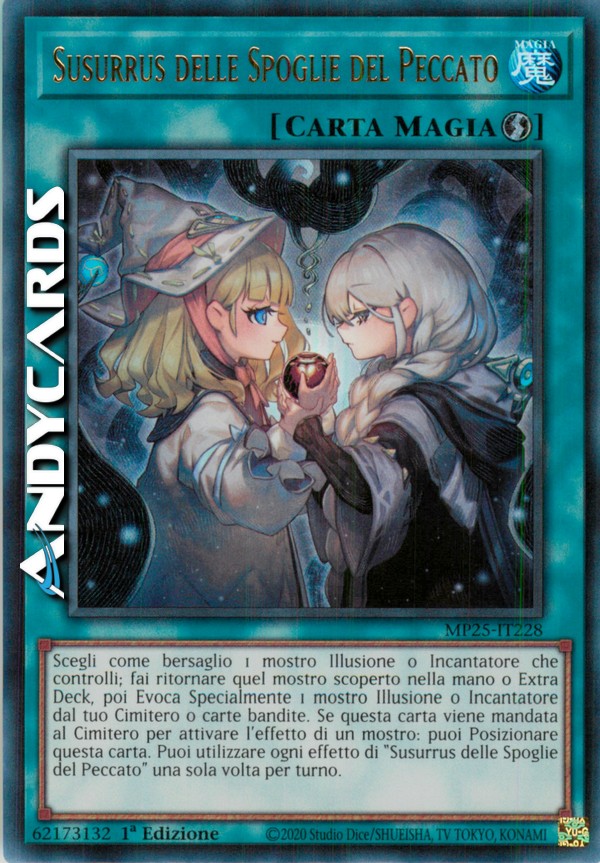 Scegli come bersaglio 1 mostro Illusione o Incantatore che controlli; fai ritornare quel mostro scoperto nella mano o Extra Deck, poi Evoca Specialmente 1 mostro Illusione o Incantatore dal tuo Cimitero o carte bandite. Se questa carta viene mandata al Cimitero per attivare l'effetto di un mostro: puoi Posizionare questa carta. Puoi utilizzare ogni effetto di "Susurrus delle Spoglie del Peccato" una sola volta per turno.