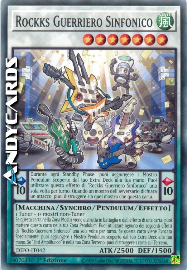 Effetto Pendulum: Durante ogni Standby Phase: puoi aggiungere 1 Mostro Pendulum scoperto dal tuo Extra Deck alla tua mano. Puoi utilizzare questo effetto di "Rockks Guerriero Sinfonico" una sola volta per turno. Quando un mostro dell'avversario dichiara un attacco: puoi distruggere sia quel mostro che questa carta.