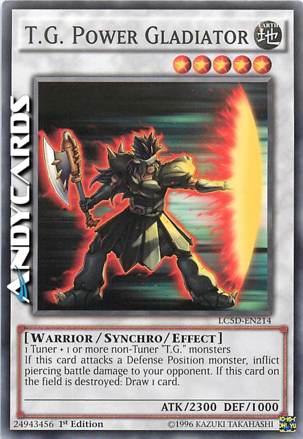 1 Tuner + 1 o più mostri non-Tuner "T.G." Durante una battaglia tra questa carta attaccante e un mostro in Posizione di Difesa il cui DEF è inferiore all'ATK di questa carta, infliggi la differenza come danno da combattimento al tuo avversario. Quando questa carta sul Terreno viene distrutta, pesca 1 carta.