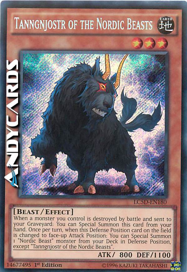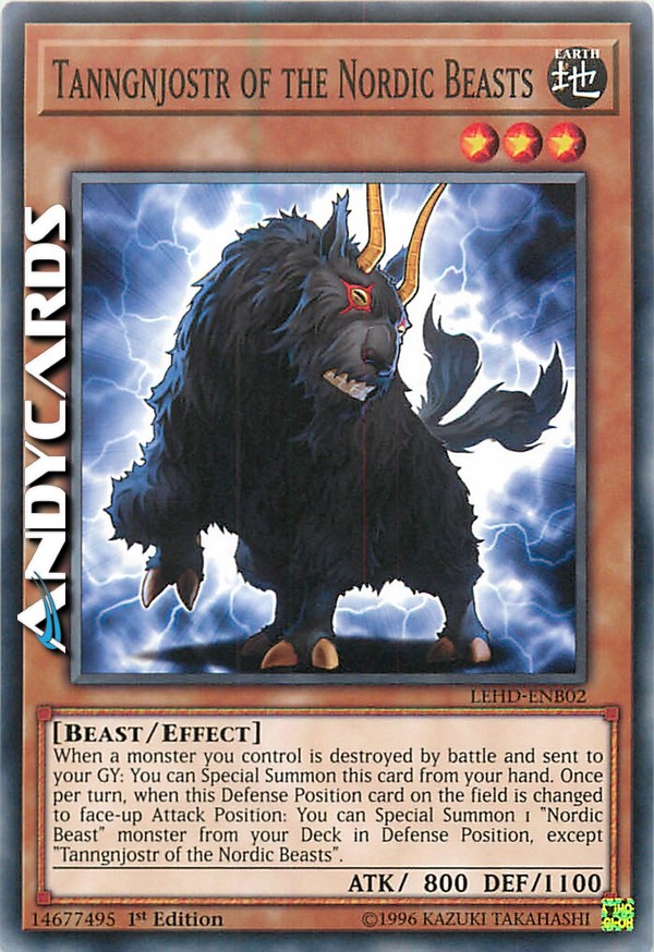 Quando un mostro che controlli viene distrutto in battaglia e mandato al tuo Cimitero: puoi Evocare Specialmente questa carta dalla tua mano. Una volta per turno, quando questa carta in Posizione di Difesa sul Terreno viene messa scoperta in Posizione di Attacco: puoi Evocare Specialmente dal tuo Deck in Posizione di Difesa 1 mostro "Bestia Nordic", eccetto "Tanngnjostr delle Bestie Nordic".