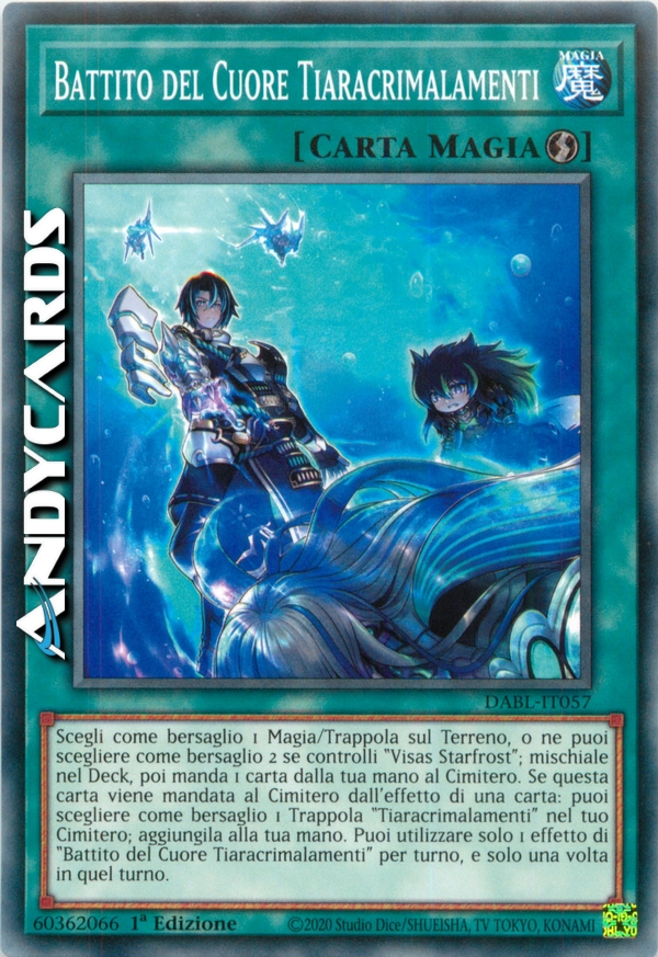 Scegli come bersaglio 1 Magia/Trappola sul Terreno, o ne puoi scegliere come bersaglio 2 se controlli "Visas Starfrost"; mischiale nel Deck, poi manda 1 carta dalla tua mano al Cimitero. Se questa carta viene mandata al Cimitero dall'effetto di una carta: puoi scegliere come bersaglio 1 Trappola "Tiaracrimalamenti" nel tuo Cimitero; aggiungila alla tua mano. Puoi utilizzare solo 1 effetto di "Battito del Cuore Tiaracrimalamenti" per turno, e solo una volta in quel turno.