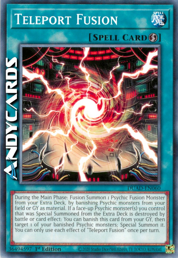 During the Main Phase: Fusion Summon 1 Psychic Fusion Monster from your Extra Deck, by banishing Psychic monsters from your field or GY as material. If a face-up Psychic monster(s) you control that was Special Summoned from the Extra Deck is destroyed by battle or card effect: You can banish this card from your GY, then target 1 of your banished Psychic monsters; Special Summon it. You can only use each effect of "Teleport Fusion" once per turn.
