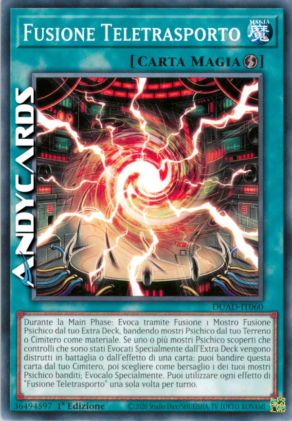 Durante la Main Phase: Evoca tramite Fusione 1 Mostro Fusione Psichico dal tuo Extra Deck, bandendo mostri Psichico dal tuo Terreno o Cimitero come materiale. Se uno o più mostri Psichico scoperti che controlli che sono stati Evocati Specialmente dall'Extra Deck vengono distrutti in battaglia o dall'effetto di una carta: puoi bandire questa carta dal tuo Cimitero, poi scegliere come bersaglio 1 dei tuoi mostri Psichico banditi; Evocalo Specialmente. Puoi utilizzare ogni effetto di "Fusione Teletrasporto" una sola volta per turno.