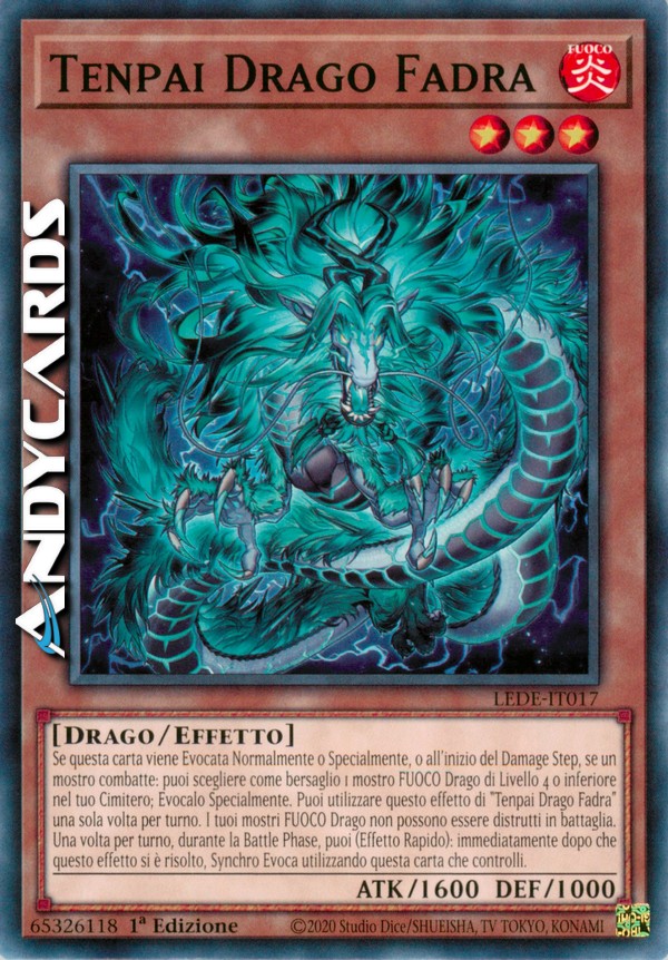 Se questa carta viene Evocata Normalmente o Specialmente, o all'inizio del Damage Step, se un mostro combatte: puoi scegliere come bersaglio 1 mostro FUOCO Drago di Livello 4 o inferiore nel tuo Cimitero; Evocalo Specialmente. Puoi utilizzare questo effetto di "Tenpai Drago Fadra" una sola volta per turno. I tuoi mostri FUOCO Drago non possono essere distrutti in battaglia. Una volta per turno, durante la Battle Phase, puoi (Effetto Rapido): immediatamente dopo che questo effetto si è risolto, Synchro Evoca utilizzando questa carta che controlli.