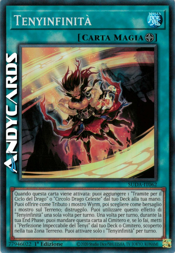 Quando questa carta viene attivata: puoi aggiungere 1 "Tramite per il Ciclo del Drago" o "Circolo Drago Celeste" dal tuo Deck alla tua mano. Puoi offrire come Tributo 1 mostro Wyrm, poi scegliere come bersaglio 1 mostro sul Terreno; distruggilo. Puoi utilizzare questo effetto di "Tenyinfinità" una sola volta per turno. Una volta per turno, durante la tua End Phase: puoi mandare questa carta al Cimitero e, se lo fai, metti 1 "Perfezione Impeccabile del Tenyi" dal tuo Deck o Cimitero, scoperto nella tua Zona Terreno. Puoi attivare solo 1 "Tenyinfinità" per turno.