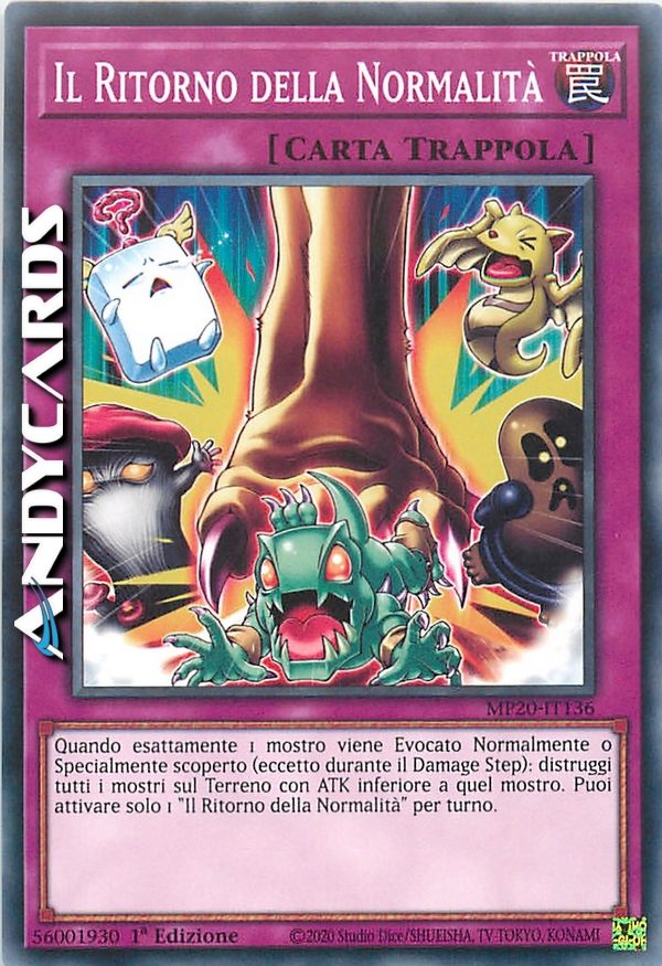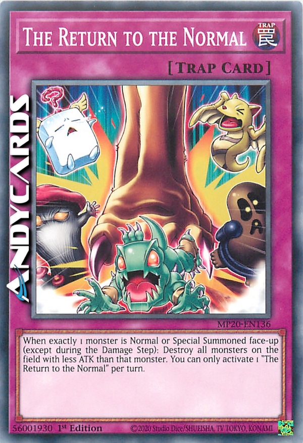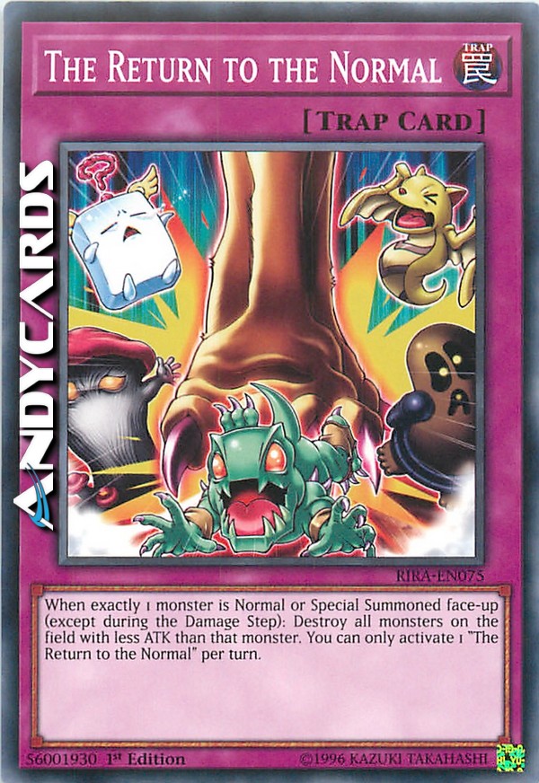 Quando esattamente 1 mostro viene Evocato Normalmente o Specialmente scoperto (eccetto durante il Damage Step): distruggi tutti i mostri sul Terreno con ATK inferiore a quel mostro. Puoi attivare solo 1 "Il Ritorno della Normalità" per turno.