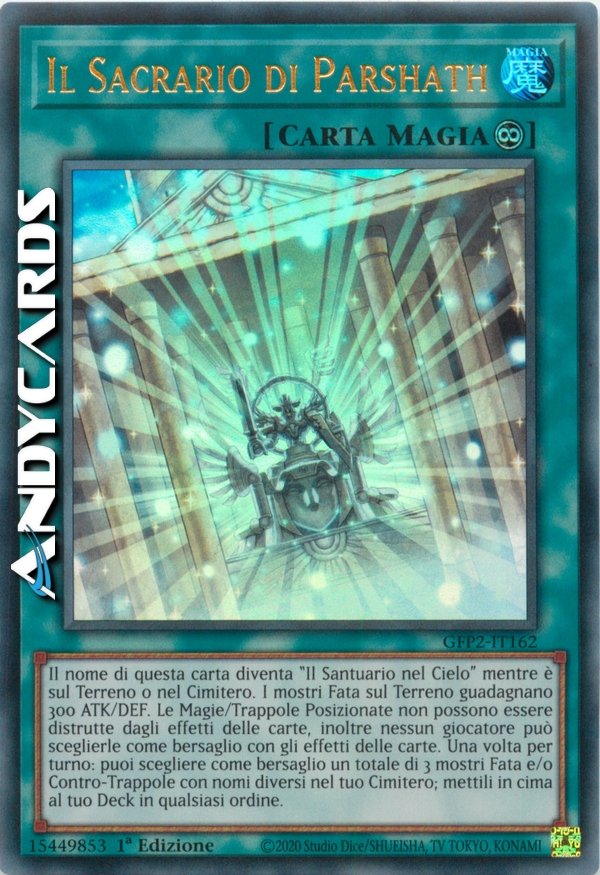 Il nome di questa carta diventa "Il Santuario nel Cielo" mentre è sul Terreno o nel Cimitero. I mostri Fata sul Terreno guadagnano 300 ATK/DEF. Le Magie/Trappole Posizionate non possono essere scelte come bersaglio, o distrutte, dagli effetti delle carte. Una volta per turno: puoi scegliere come bersaglio un totale di 3 mostri Fata e/o Contro-Trappole con nomi diversi nel tuo Cimitero; mettili in cima al tuo Deck in qualsiasi ordine.