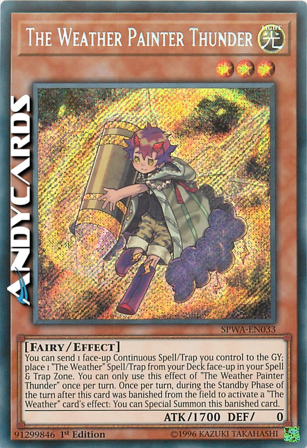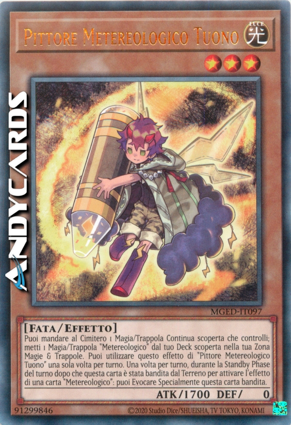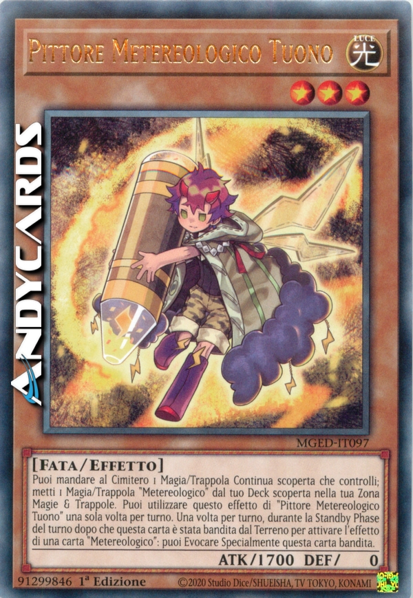 Puoi mandare al Cimitero 1 Magia/Trappola Continua scoperta che controlli: metti 1 Magia/Trappola "Metereologico" dal tuo Deck scoperta nella tua Zona Magie & Trappole. Puoi utilizzare questo effetto di "Pittore Metereologico Tuono" una sola volta per turno. Una volta per turno, durante la Standby Phase del turno dopo che questa carta è stata bandita dal Terreno per attivare l'effetto di una carta "Metereologico": puoi Evocare Specialmente questa carta bandita.