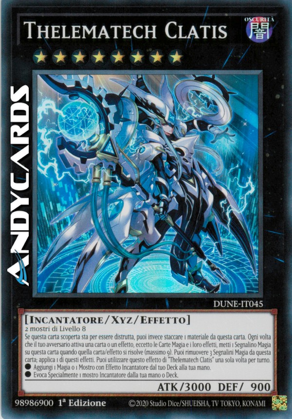 Se questa carta scoperta sta per essere distrutta, puoi invece staccare 1 materiale da questa carta. Ogni volta che il tuo avversario attiva una carta o un effetto, eccetto le Carte Magia e i loro effetti, metti 1 Segnalino Magia su questa carta quando quella carta/effetto si risolve (massimo 9). Puoi rimuovere 3 Segnalini Magia da questa carta; applica 1 di questi effetti. Puoi utilizzare questo effetto di "Thelematech Clatis" una sola volta per turno.