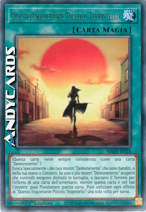 Evoca Specialmente 1 dei tuoi mostri "Demoneterno" che sono banditi, o nella tua mano o Cimitero. Se uno o più mostri "Demoneterno" scoperti che controlli vengono distrutti in battaglia, o lasciano il Terreno per l'effetto di una carta dell'avversario, mentre questa carta è nel tuo Cimitero: puoi Posizionare questa carta. Puoi utilizzare ogni effetto di "Questo Inquietante Piccolo Teppistello" una sola volta per turno.