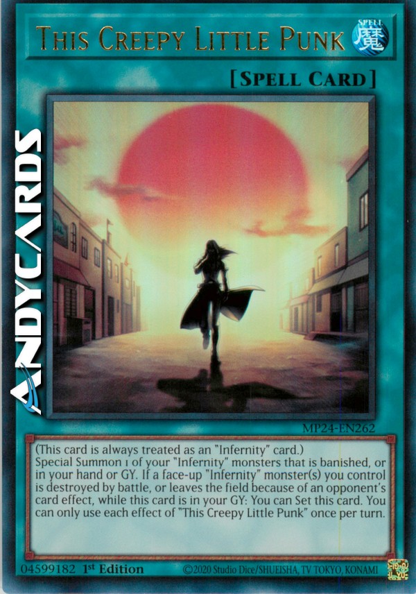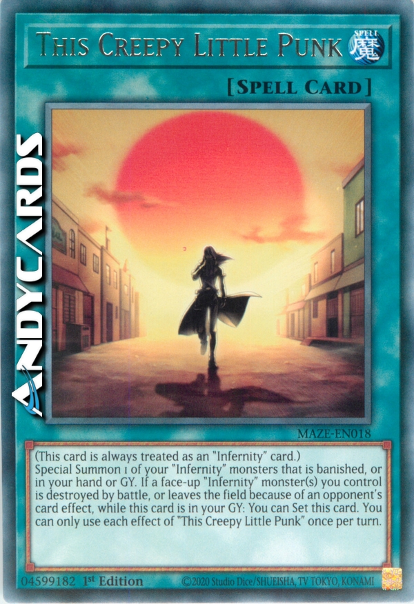 Special Summon 1 of your "Infernity" monsters that is banished, or in your hand or GY. If a face-up "Infernity" monster(s) you control is destroyed by battle, or leaves the field because of an opponent's card effect, while this card is in your GY: You can Set this card. You can only use each effect of "This Creepy Little Punk" once per turn.