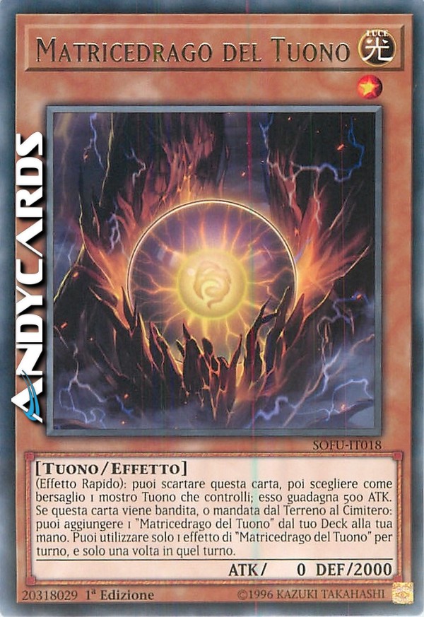 (Effetto Rapido): puoi scartare questa carta, poi scegliere come bersaglio 1 mostro Tuono che controlli; esso guadagna 500 ATK. Se questa carta viene bandita, o mandata dal Terreno al Cimitero: puoi aggiungere 1 "Matricedrago del Tuono" dal tuo Deck alla tua mano. Puoi utilizzare solo 1 effetto di "Matricedrago del Tuono" per turno, e solo una volta in quel turno.