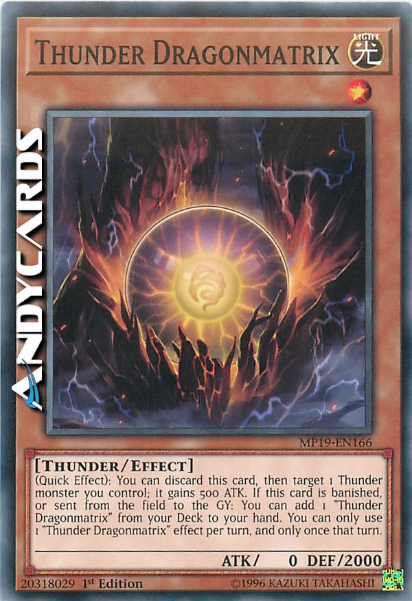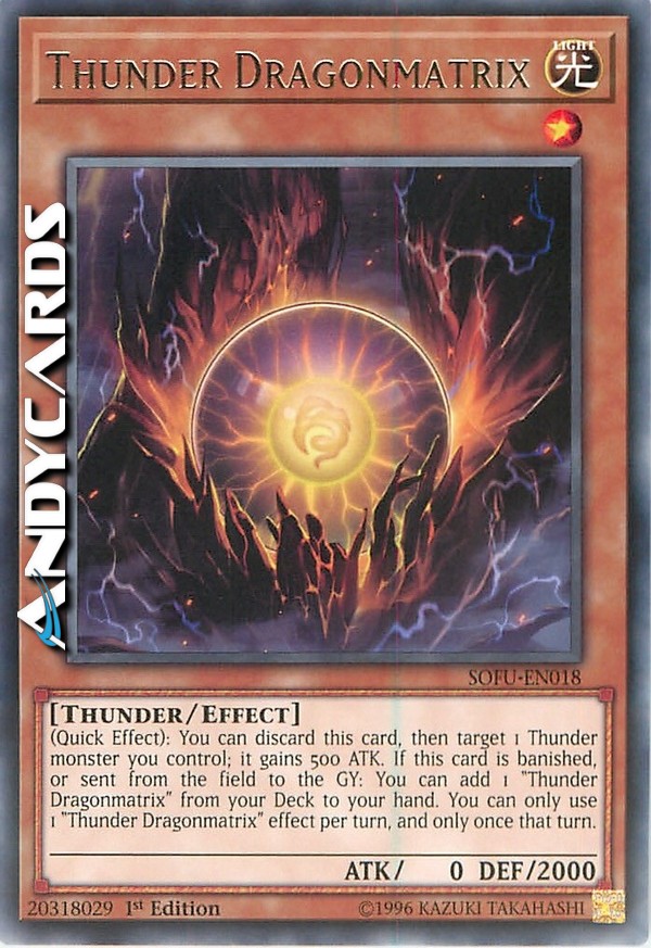 (Quick Effect): You can discard this card, then target 1 Thunder monster you control; it gains 500 ATK. If this card is banished, or sent from the field to the GY: You can add 1 "Thunder Dragonmatrix" from your Deck to your hand. You can only use 1 "Thunder Dragonmatrix" effect per turn, and only once that turn.