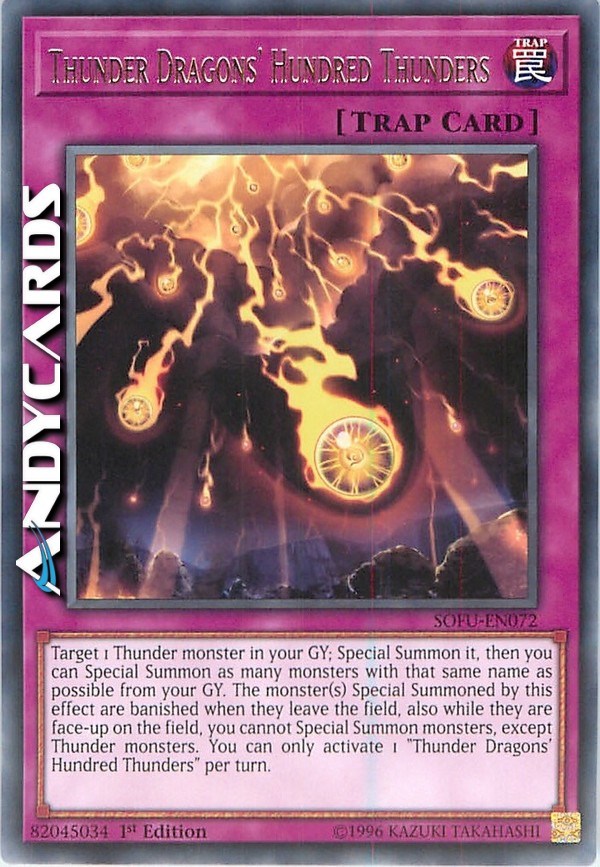 Scegli come bersaglio 1 mostro Tuono nel tuo Cimitero; Evocalo Specialmente, poi puoi Evocare Specialmente tanti mostri con quello stesso nome quanti possibile dal tuo Cimitero. I mostri Evocati Specialmente da questo effetto vengono banditi quando lasciano il Terreno, inoltre mentre sono scoperti sul Terreno, non puoi Evocare Specialmente mostri, eccetto mostri Tuono. Puoi attivare solo 1 "I Cento Tuoni dei Draghi del Tuono" per turno.