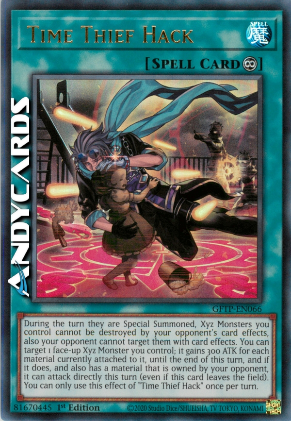 During the turn they are Special Summoned, Xyz Monsters you control cannot be destroyed by your opponent's card effects, also your opponent cannot target them with card effects. You can target 1 face-up Xyz Monster you control; it gains 300 ATK for each material currently attached to it, until the end of this turn, and if it does, and also has a material that is owned by your opponent, it can attack directly this turn (even if this card leaves the field). You can only use this effect of "Time Thief Hack" once per turn.