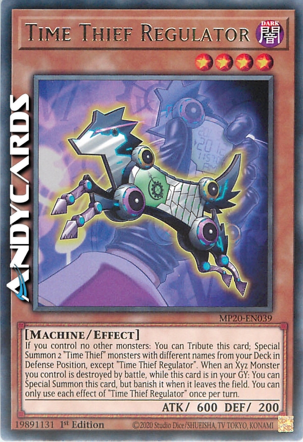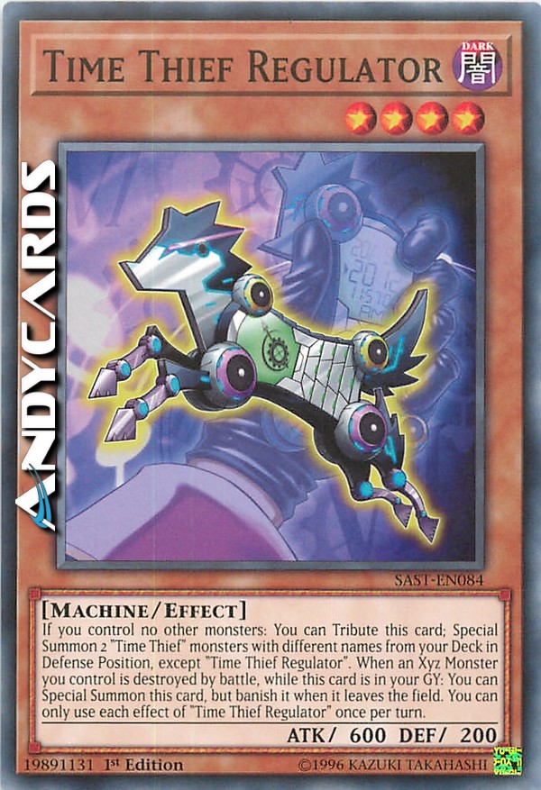 If you control no other monsters: You can Tribute this card; Special Summon 2 "Time Thief" monsters with different names from your Deck in Defense Position, except "Time Thief Regulator". When an Xyz Monster you control is destroyed by battle, while this card is in your GY: You can Special Summon this card, but banish it when it leaves the field. You can only use each effect of "Time Thief Regulator" once per turn.