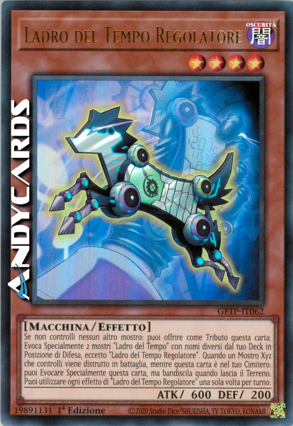 Se non controlli nessun altro mostro: puoi offrire come Tributo questa carta; Evoca Specialmente 2 mostri "Ladro del Tempo" con nomi diversi dal tuo Deck in Posizione di Difesa, eccetto "Ladro del Tempo Regolatore". Quando un Mostro Xyz che controlli viene distrutto in battaglia, mentre questa carta è nel tuo Cimitero: puoi Evocare Specialmente questa carta, ma bandiscila quando lascia il Terreno. Puoi utilizzare ogni effetto di "Ladro del Tempo Regolatore" una sola volta per turno.