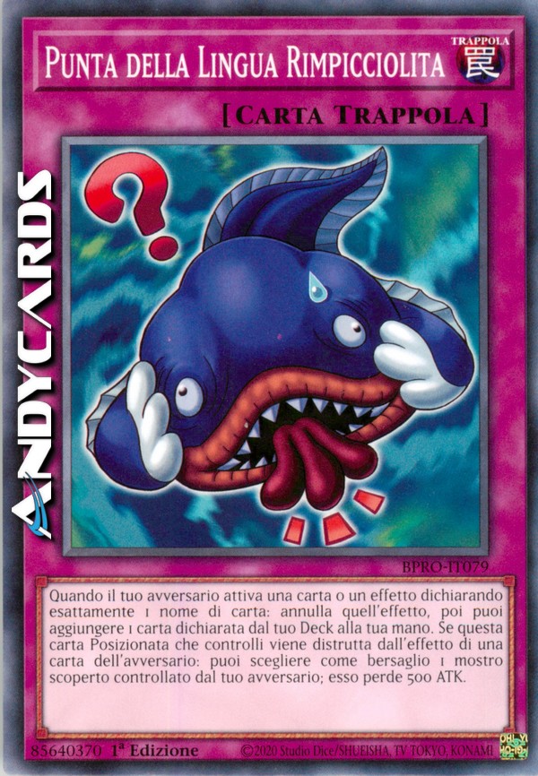 Quando il tuo avversario attiva una carta o un effetto dichiarando esattamente 1 nome di carta: annulla quell'effetto, poi puoi aggiungere 1 carta dichiarata dal tuo Deck alla tua mano. Se questa carta Posizionata che controlli viene distrutta dall'effetto di una carta dell'avversario: puoi scegliere come bersaglio 1 mostro scoperto controllato dal tuo avversario; esso perde 500 ATK.