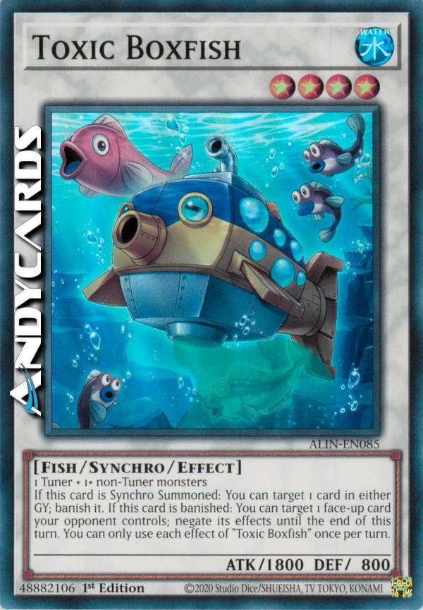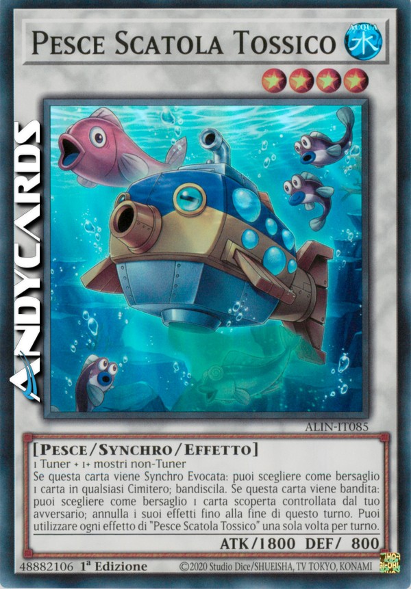 Se questa carta viene Synchro Evocata: puoi scegliere come bersaglio 1 carta in qualsiasi Cimitero; bandiscila. Se questa carta viene bandita: puoi scegliere come bersaglio 1 carta scoperta controllata dal tuo avversario; annulla i suoi effetti fino alla fine di questo turno. Puoi utilizzare ogni effetto di "Pesce Scatola Tossico" una sola volta per turno.