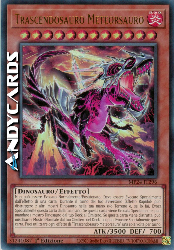 Non può essere Evocato Normalmente/Posizionato. Deve essere Evocato Specialmente dall'effetto di una carta. Durante il turno del tuo avversario (Effetto Rapido): puoi distruggere 2 altri mostri Dinosauro nella tua mano e/o Terreno e, se lo fai, Evoca Specialmente questa carta dalla tua mano. Se questa carta viene Evocata Specialmente: puoi mandare 1 mostro Dinosauro dal tuo Deck al Cimitero. Se questa carta viene distrutta: puoi mischiare 1 Mostro Normale dal tuo Cimitero nel Deck, poi puoi Evocare Specialmente questa carta. Puoi utilizzare ogni effetto di "Trascendosauro Meteorsauro" una sola volta per turno.