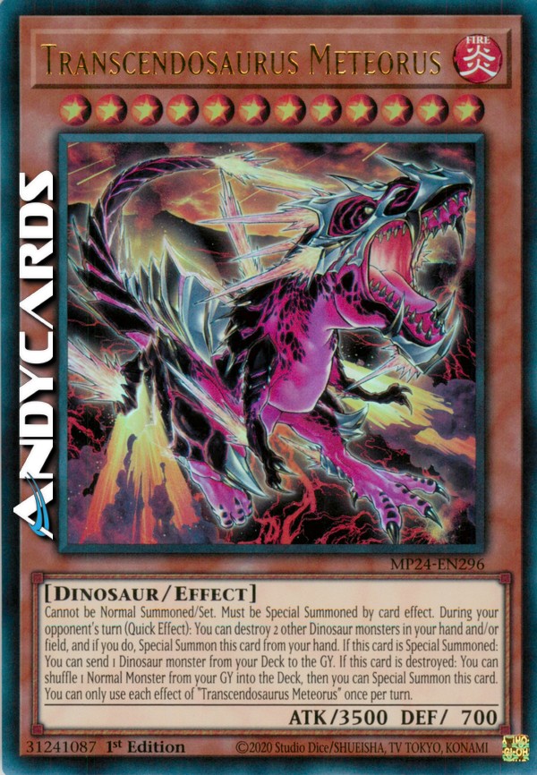 Cannot be Normal Summoned/Set. Must be Special Summoned by card effect. During your opponent's turn (Quick Effect): You can destroy 2 other Dinosaur monsters in your hand and/or field, and if you do, Special Summon this card from your hand. If this card is Special Summoned: You can send 1 Dinosaur monster from your Deck to the GY. If this card is destroyed: You can shuffle 1 Normal Monster from your GY into the Deck, then you can Special Summon this card. You can only use each effect of "Transcendosaurus Meteorus" once per turn.