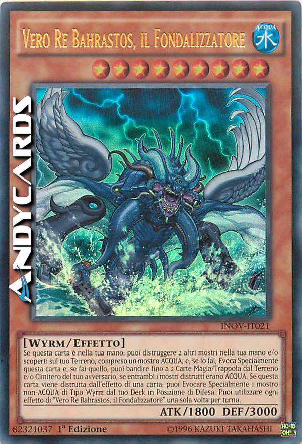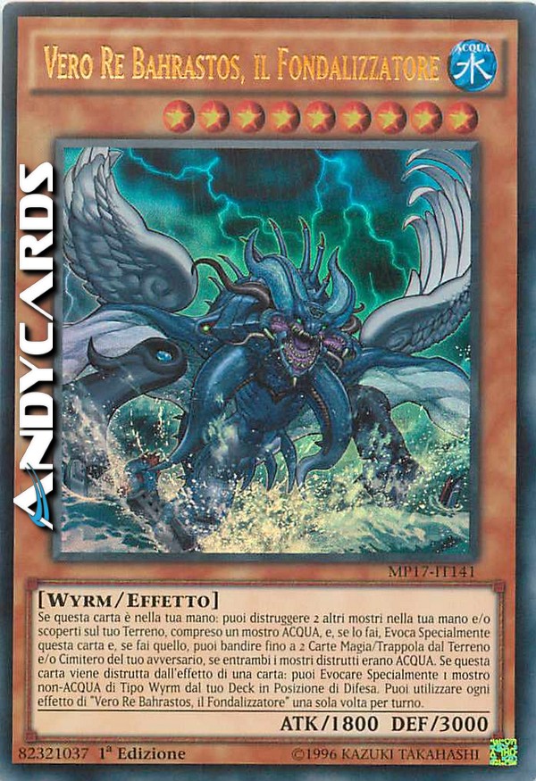 Se questa carta è nella tua mano: puoi distruggere 2 altri mostri nella tua mano e/o scoperti sul tuo Terreno, compreso un mostro ACQUA, e, se lo fai, Evoca Specialmente questa carta e, se fai quello, puoi bandire fino a 2 Carte Magia/Trappola dal Terreno e/o Cimitero del tuo avversario, se entrambi i mostri distrutti erano ACQUA. Se questa carta viene distrutta dall'effetto di una carta: puoi Evocare Specialmente 1 mostro non-ACQUA di Tipo Wyrm dal tuo Deck in Posizione di Difesa. Puoi utilizzare ogni effetto di "Vero Re Bahrastos, il Fondalizzatore" una sola volta per turno.