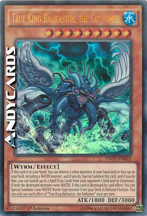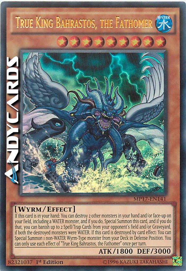 If this card is in your hand: You can destroy 2 other monsters in your hand and/or face-up on your field, including a WATER monster, and if you do, Special Summon this card, and if you do that, you can banish up to 2 Spell/Trap Cards from your opponent's field and/or Graveyard, if both the destroyed monsters were WATER. If this card is destroyed by card effect: You can Special Summon 1 non-WATER Wyrm-Type monster from your Deck in Defense Position. You can only use each effect of "True King Bahrastos, the Fathomer" once per turn.