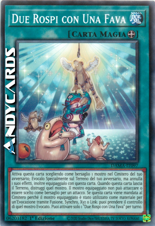 Attiva questa carta scegliendo come bersaglio 1 mostro nel Cimitero del tuo avversario; Evocalo Specialmente sul Terreno del tuo avversario, ma annulla i suoi effetti, inoltre equipaggialo con questa carta. Quando questa carta lascia il Terreno, distruggi quel mostro. Il mostro equipaggiato non può attaccare o essere scelto come bersaglio per un attacco. Se questa carta viene mandata al Cimitero perché il mostro equipaggiato è stato utilizzato come materiale per un'Evocazione tramite Fusione, Synchro, Xyz o Link: puoi prendere il controllo di quel mostro Evocato. Puoi attivare solo 1 "Due Rospi con Una Fava" per turno.