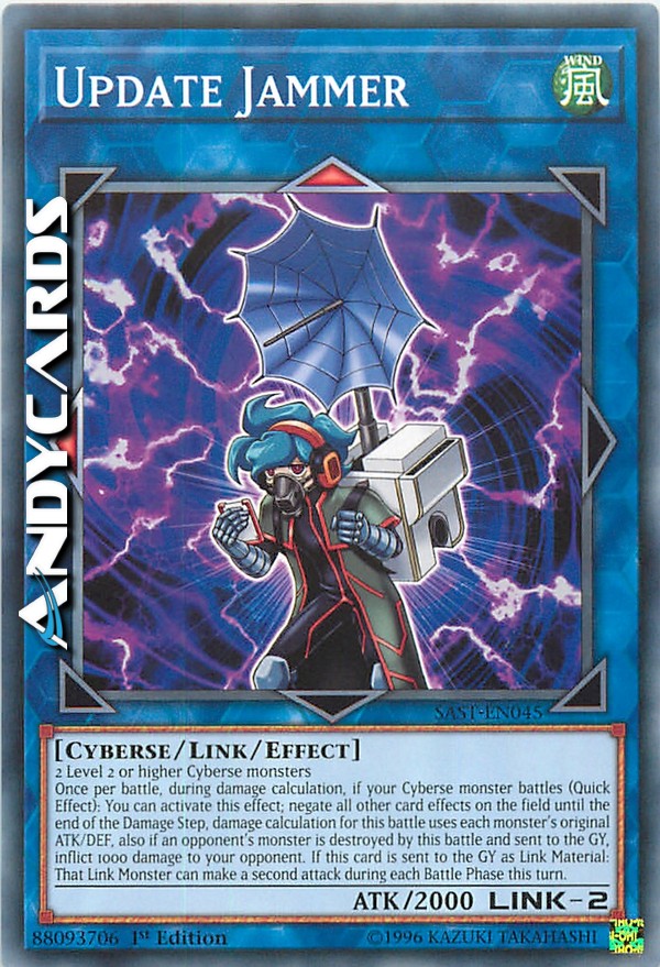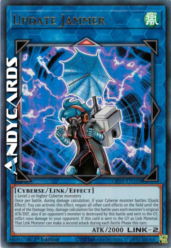 Once per battle, during damage calculation, if your Cyberse monster battles (Quick Effect): You can activate this effect; negate all other card effects on the field until the end of the Damage Step, damage calculation for this battle uses each monster's original ATK/DEF, also if an opponent's monster is destroyed by this battle and sent to the GY, inflict 1000 damage to your opponent. If this card is sent to the GY as Link Material: That Link Monster can make a second attack during each Battle Phase this turn.