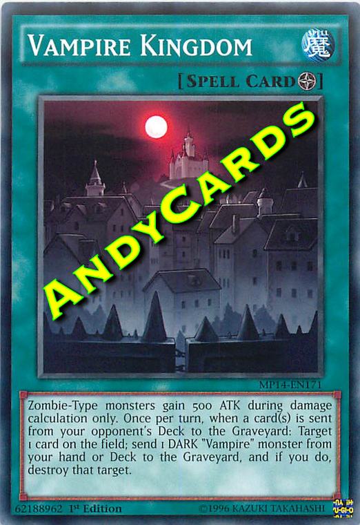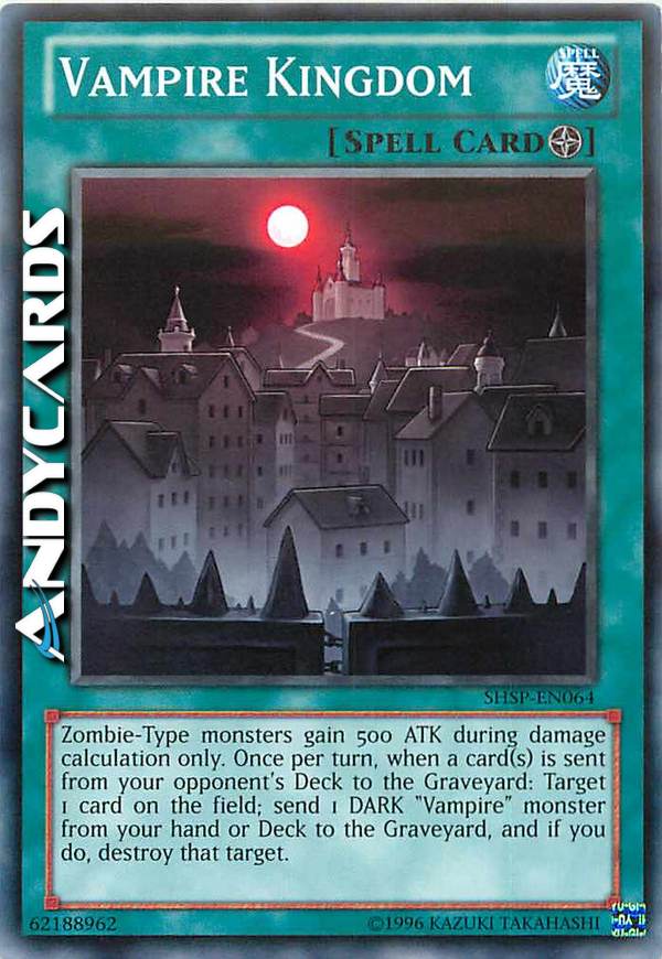 I mostri di Tipo Zombie guadagnano 500 ATK solamente durante il calcolo dei danni. Una volta per turno, quando una o più carte vengono mandate dal Deck del tuo avversario al Cimitero: scegli come bersaglio 1 carta sul Terreno; manda 1 mostro OSCURITÀ "Vampiro" dalla tua mano o Deck al Cimitero e, se lo fai, distruggi quel bersaglio.
