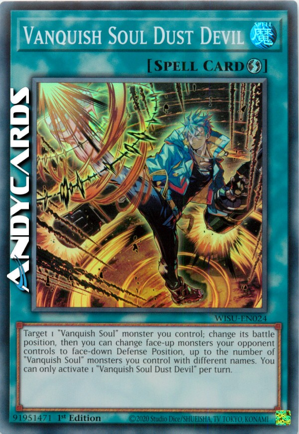 Target 1 "Vanquish Soul" monster you control; change its battle position, then you can change face-up monsters your opponent controls to face-down Defense Position, up to the number of "Vanquish Soul" monsters you control with different names. You can only activate 1 "Vanquish Soul Dust Devil" per turn.