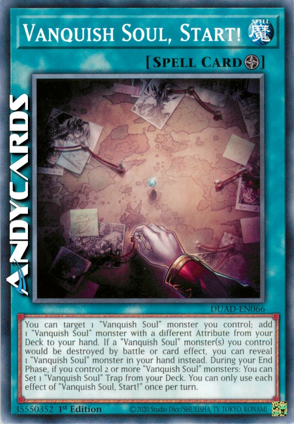 You can target 1 "Vanquish Soul" monster you control; add 1 "Vanquish Soul" monster with a different Attribute from your Deck to your hand. If a "Vanquish Soul" monster(s) you control would be destroyed by battle or card effect, you can reveal 1 "Vanquish Soul" monster in your hand instead. During your End Phase, if you control 2 or more "Vanquish Soul" monsters: You can Set 1 "Vanquish Soul" Trap from your Deck. You can only use each effect of "Vanquish Soul, Start!" once per turn.