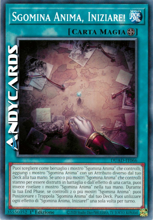 Puoi scegliere come bersaglio 1 mostro "Sgomina Anima" che controlli; aggiungi 1 mostro "Sgomina Anima" con un Attributo diverso dal tuo Deck alla tua mano. Se uno o più mostri "Sgomina Anima" che controlli stanno per essere distrutti in battaglia o dall'effetto di una carta, puoi invece rivelare 1 mostro "Sgomina Anima" nella tua mano. Durante la tua End Phase, se controlli 2 o più mostri "Sgomina Anima": puoi Posizionare 1 Trappola "Sgomina Anima" dal tuo Deck. Puoi utilizzare ogni effetto di "Sgomina Anima, Iniziare!" una sola volta per turno.