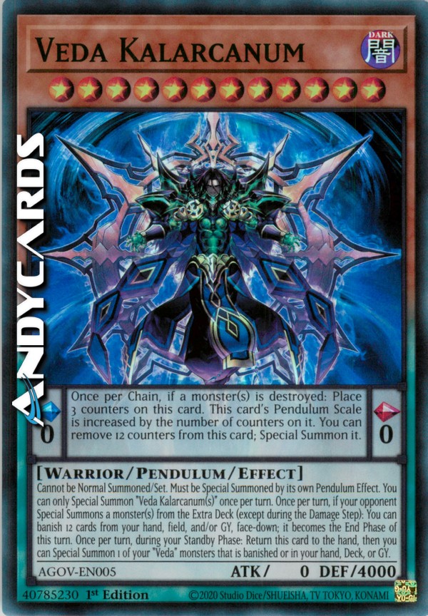 Cannot be Normal Summoned/Set. Must be Special Summoned by its own Pendulum Effect. You can only Special Summon "Veda Kalarcanum(s)" once per turn. Once per turn, if your opponent Special Summons a monster(s) from the Extra Deck (except during the Damage Step): You can banish 12 cards from your hand, field, and/or GY, face-down; it becomes the End Phase of this turn. Once per turn, during your Standby Phase: Return this card to the hand, then you can Special Summon 1 of your "Veda" monsters that is banished or in your hand, Deck, or GY.