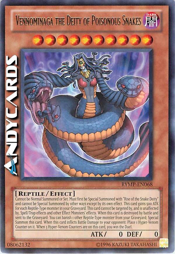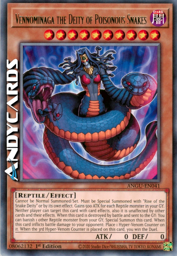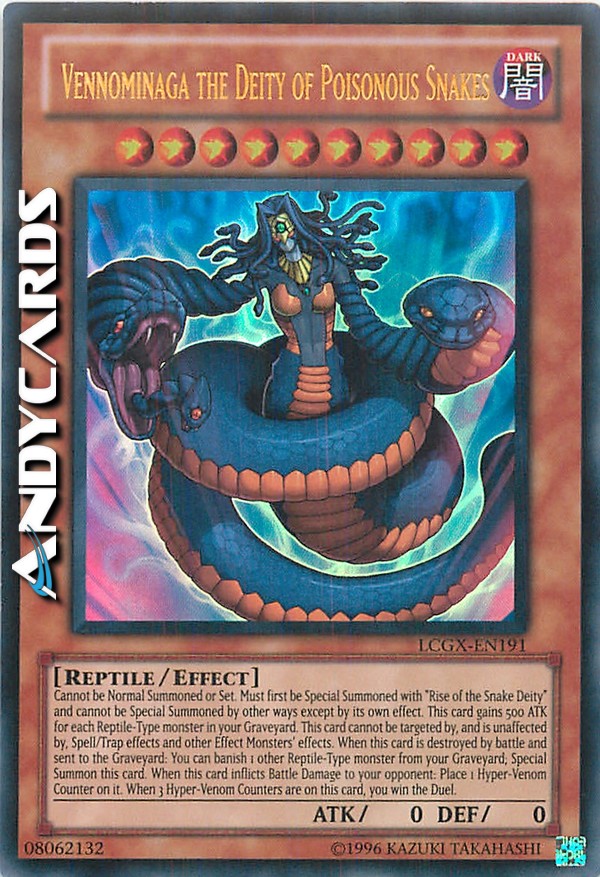 Cannot be Normal Summoned or Set. Must first be Special Summoned with "Rise of the Snake Deity" and cannot be Special Summoned by other ways except by its own effect. This card gains 500 ATK for each Reptile-Type monster in your Graveyard. This card cannot be targeted by, and is unaffected by, Spell/Trap effects and other Effect Monsters' effects. When this card is destroyed by battle and sent to the Graveyard: You can banish 1 other Reptile-Type monster from your Graveyard; Special Summon this card. When this card inflicts Battle Damage to your opponent: Place 1 Hyper-Venom Counter on it. When 3 Hyper-Venom Counters are on this card, you win the Duel.
