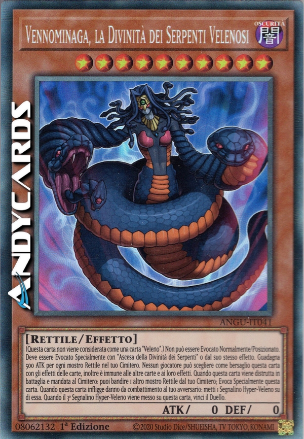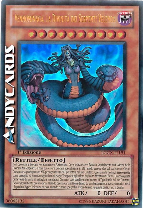 Questa carta non può essere Evocata tramite Evocazione Normale o Posizionata. Questa carta non può essere Evocata tramite Evocazione Speciale se non tramite il proprio effetto o l'effetto di "Ascesa dei Serpenti". Questa carta guadagna 500 ATK per ogni mostro di Tipo Rettile nel tuo Cimitero. Questa carta non può essere bersagliata ed è immune agli effetti di altri Mostri, Magie e Trappole. Quando questa carta viene distrutta in Battaglia e mandata al Cimitero, puoi rimuovere dal gioco 1 altro mostro di Tipo Rettile nel tuo Cimitero per Evocare tramite Evocazione Speciale questa carta. Quando questa carta infligge danno da combattimento all'avversario metti su di essa 1 Segnalino Hiper-Veleno. Quando ci sono 3 Segnalini Hiper-Veleno su questa carta, vinci il Duello.
