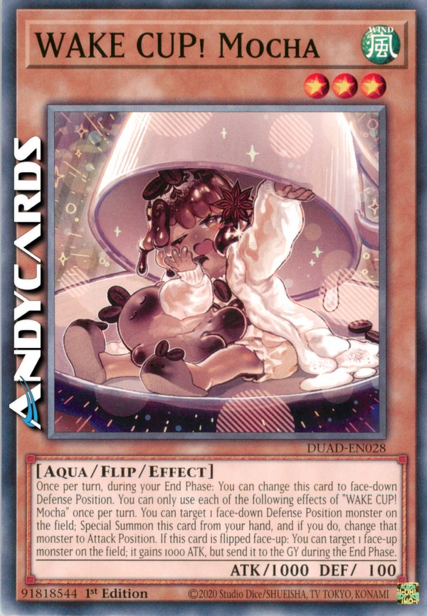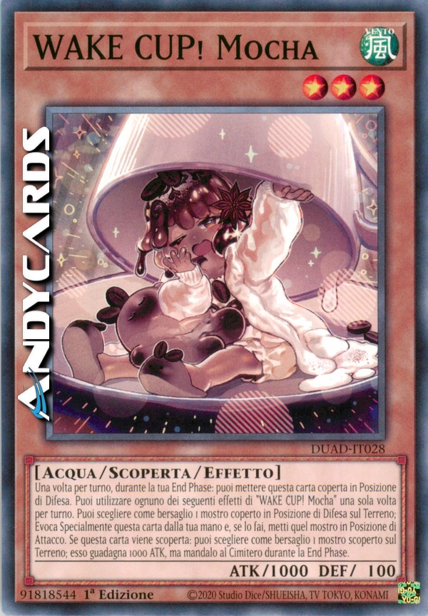 Una volta per turno, durante la tua End Phase: puoi mettere questa carta coperta in Posizione di Difesa. Puoi utilizzare ognuno dei seguenti effetti di "WAKE CUP! Mocha" una sola volta per turno. Puoi scegliere come bersaglio 1 mostro coperto in Posizione di Difesa sul Terreno; Evoca Specialmente questa carta dalla tua mano e, se lo fai, metti quel mostro in Posizione di Attacco. Se questa carta viene scoperta: puoi scegliere come bersaglio 1 mostro scoperto sul Terreno; esso guadagna 1000 ATK, ma mandalo al Cimitero durante la End Phase.